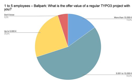 That said, 22 % of respondents generate more absolute revenue with non-TYPO3 related projects. This is an unexpected outcome within a TYPO3 related survey. A future survey might include a question about which other CMS companies rely on. Questions that help us find out the proportion of e-commerce solutions, small CMS, Wordpress, and others, even website builders, with which projects are executed.
