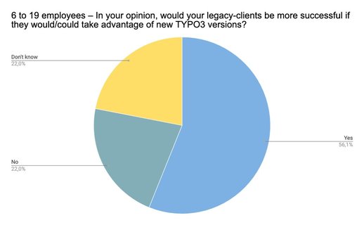 Now, this is interesting feedback: 28.7 % of participants do not think that a TYPO3 version update of the websites of legacy clients is helpful to the client’s business. We can only imagine that these are clients with business strategies that do not depend on websites. Otherwise, this is an alarming number. We would love to know more, if you are of the same persuasion or if you participated in the survey and clicked this answer!