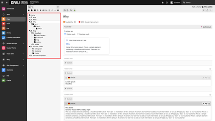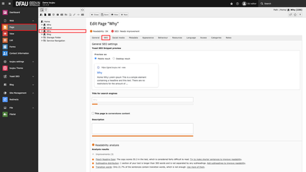 In the page properties of »Why1« we will change the page title from »Why1« to »Where«. By clicking the refresh button located at the far right to the URL segment the new path will be updated.