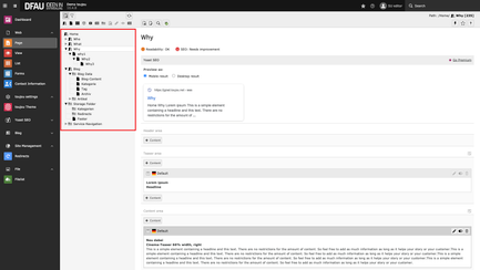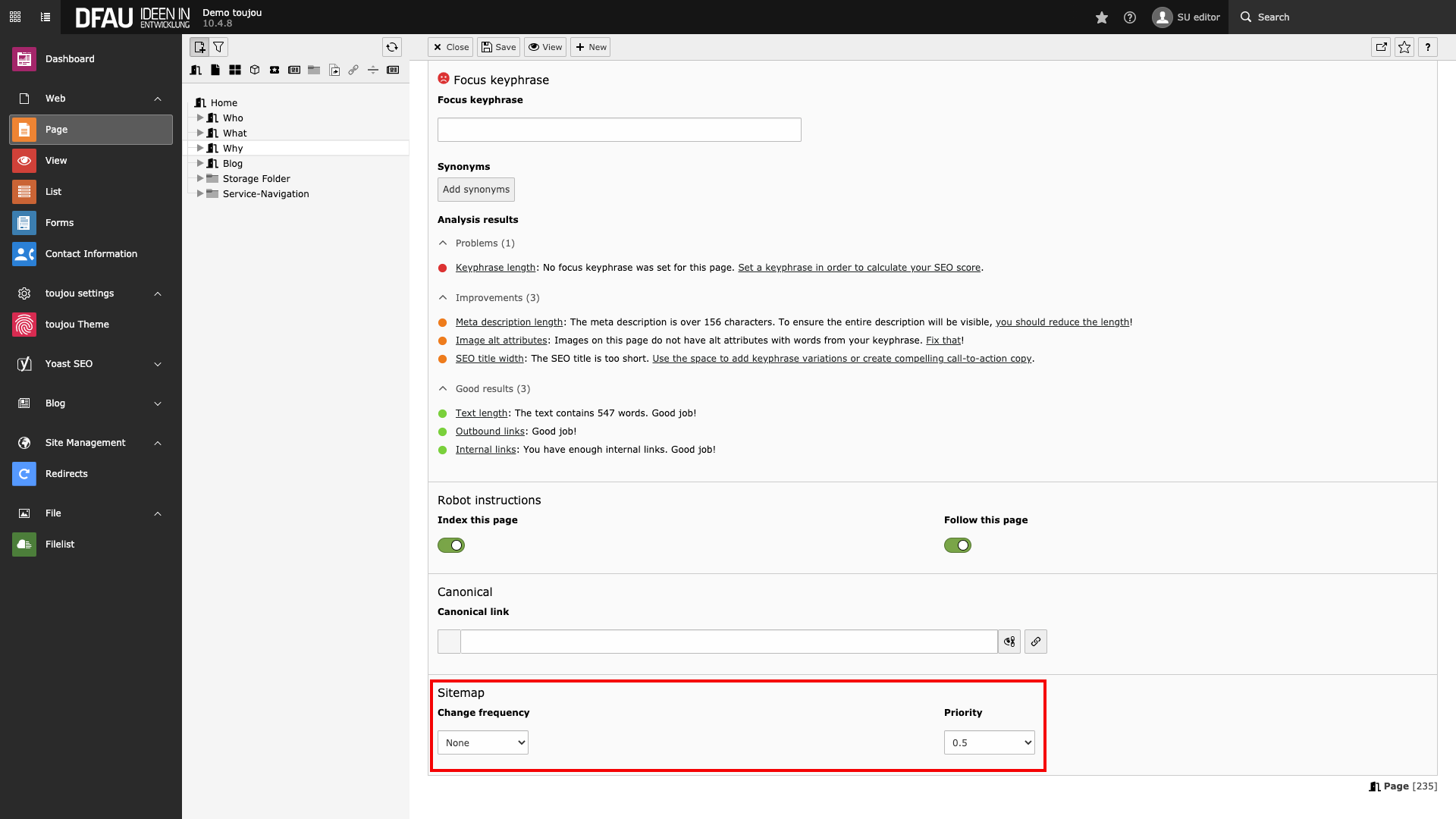 As you know the the »change frequency« and »priority« settings of a page are very important for search engine crawlers. Now they can be modified manually for both individual pages and the sitemap. Both of these functions have been added to the SEO tab but should only be edited by experienced SEO editors.