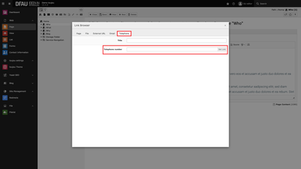 With this update, the ability to connect a telephone number has been simplified to be as easy as it is to connect pages, files and email. To generate a link in the front end to a telephone number, mark the respective text number in the rich editor text and click on the link button. The link browser will open as a new pop-up window (see screenshot). Enter the number in the phone number field in the Telephone tab which is at the far right. Please note notice: A valid phone number consists only of numbers and the character »+«.