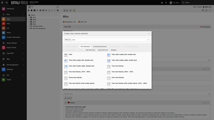 Now you can easily find the element that you are looking for with the filter function. The filter function aka the Wizard is a search field located above the element tabs. To find the element that you are looking for just enter the name in the Wizard and only the elements and tabs that match the search term will be displayed (e.g. »map«). You can also use the Wizard to filter elements by the content that you want them to display (e.g. »map«, »media«).