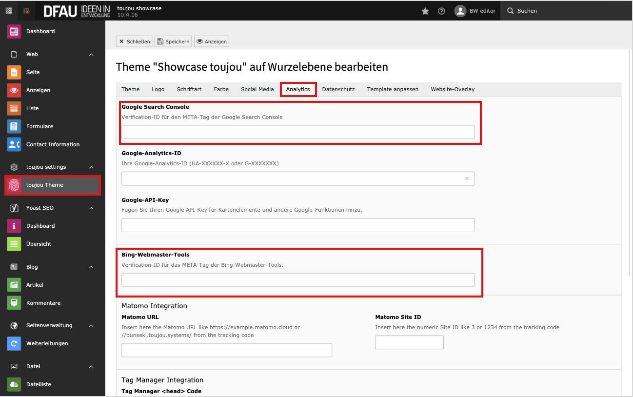 What may sound very complicated and like a lot of programming work is easily done for a TYPO3 website with toujou. Simply enter the code generated by Google or Bing (example: <meta name="google-sites-verification" content="a6k2ytwr2tjctjc1opt8b4jsvs3ij"/>), more specifically the content section, in your toujou backend.