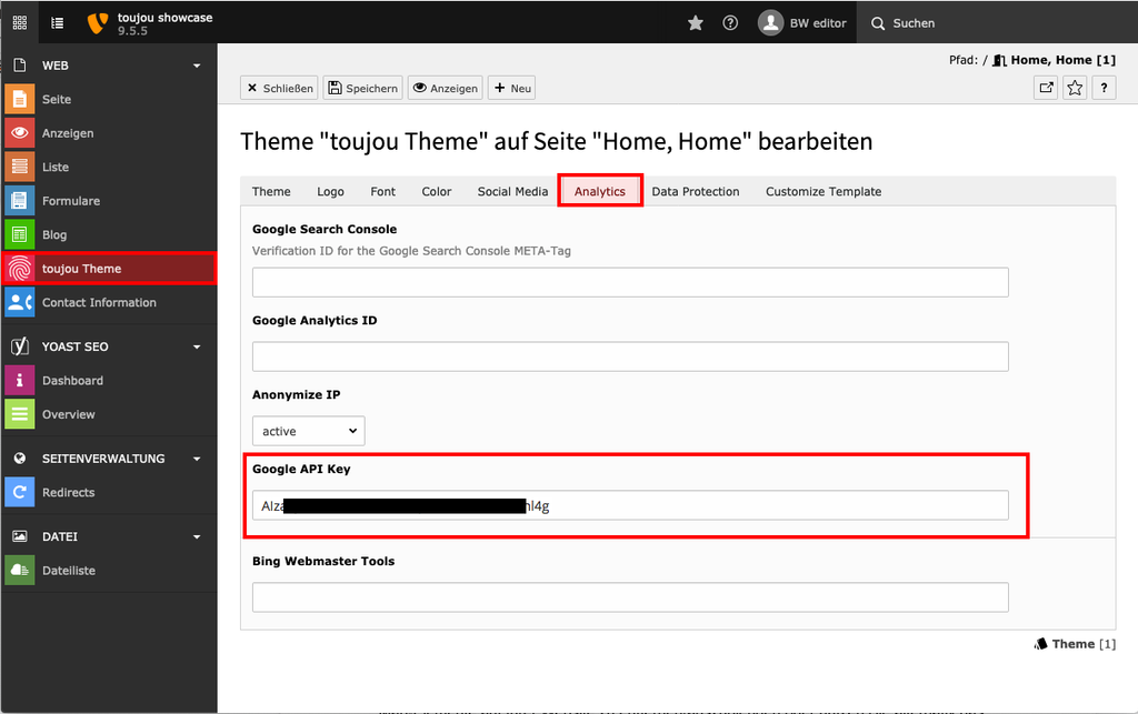 - Click the toujou Theme module and then on the tab Analytics.