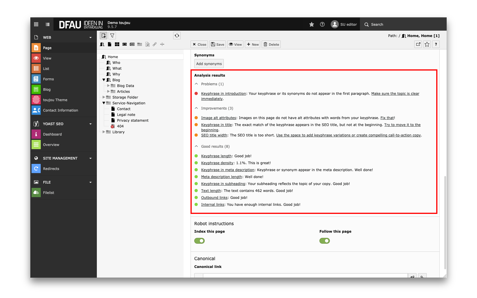 For optimal SEO results, you and your editors should create and publish a continuous stream of relevant content. To further optimize SEO results, subpages should be reviewed and continuity built on all levels of your site.