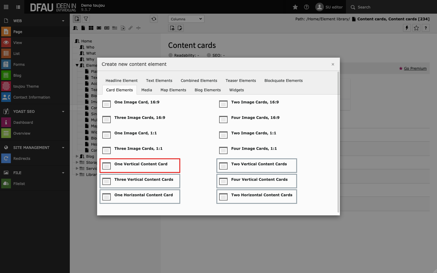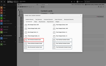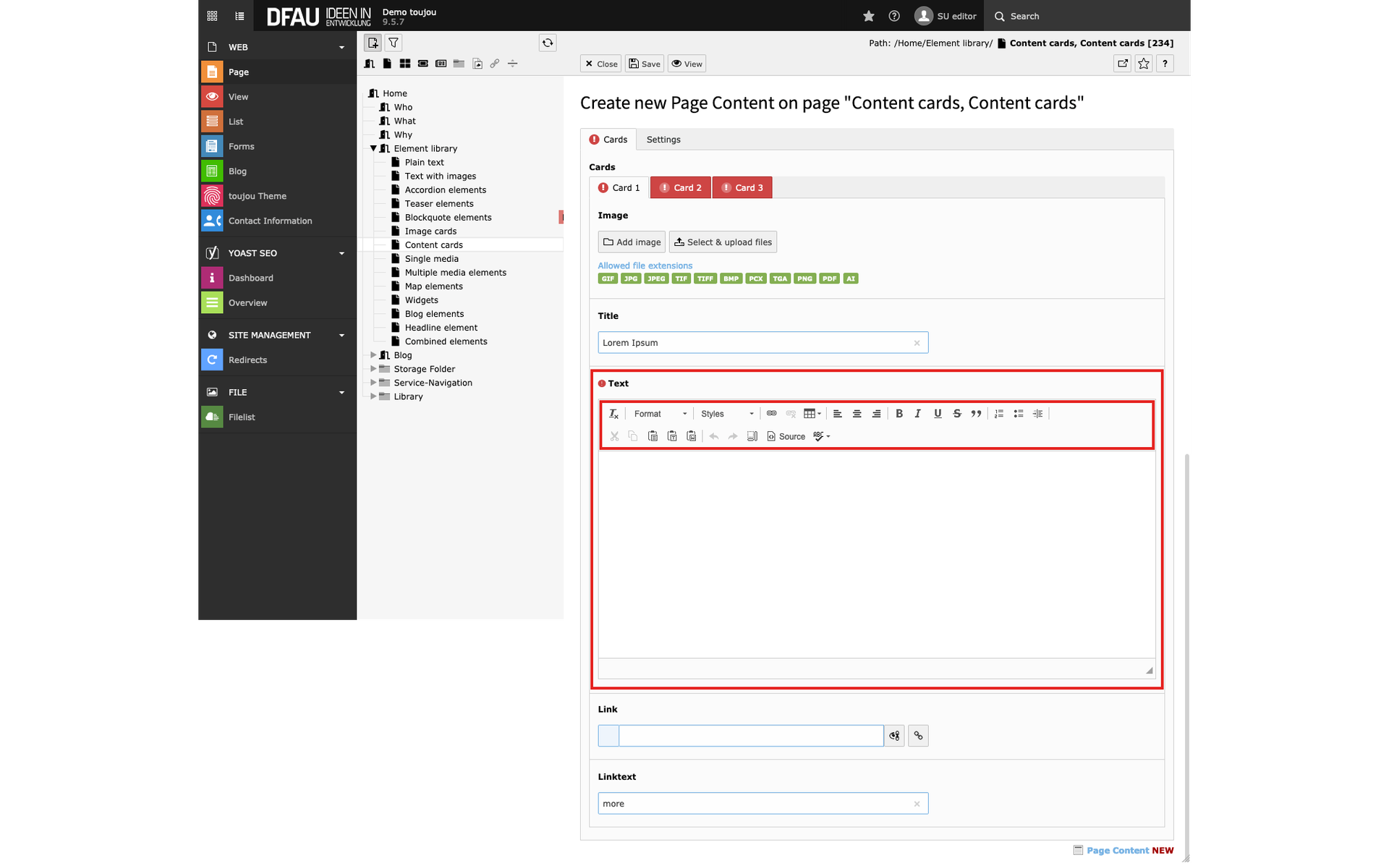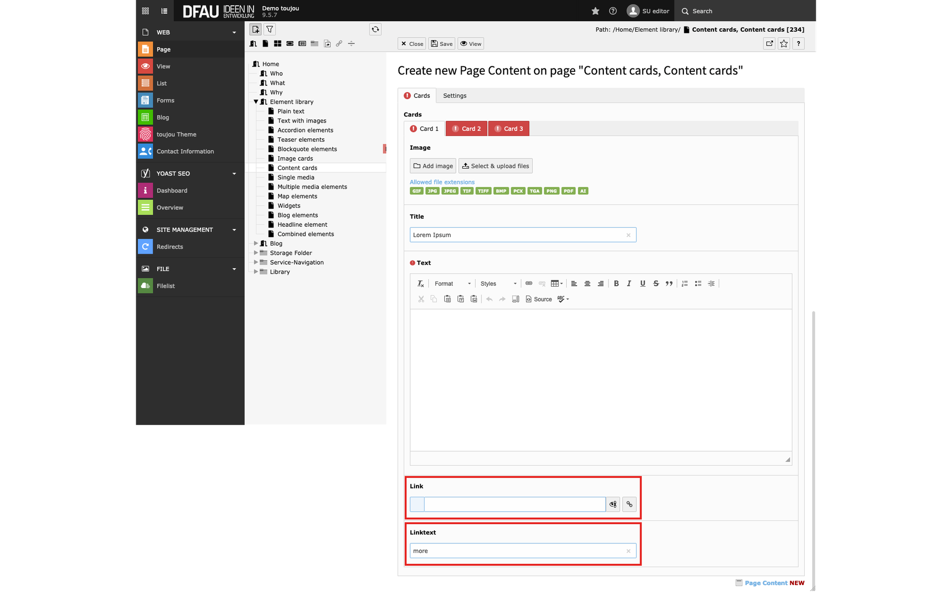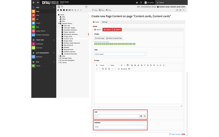 - If no link is stored, the cards can also be used as a styled content element. No button is displayed.