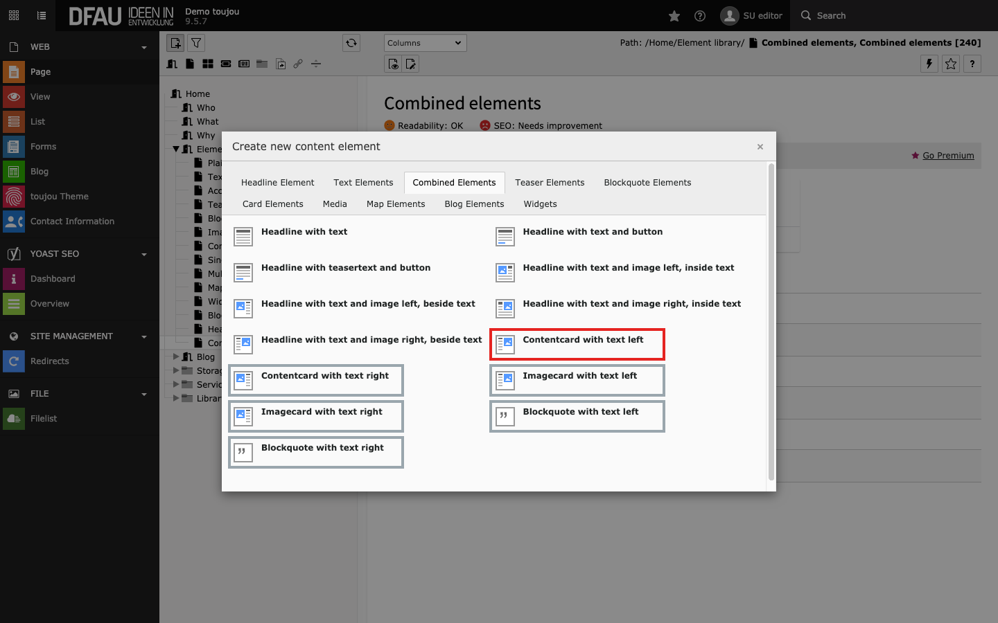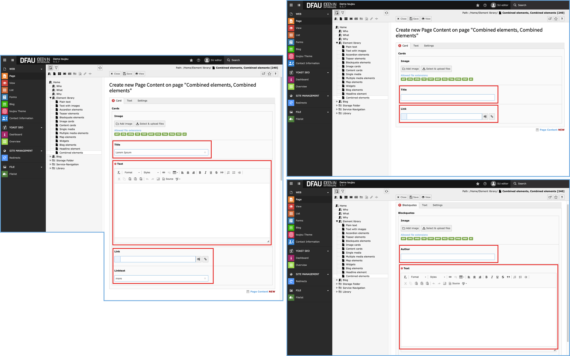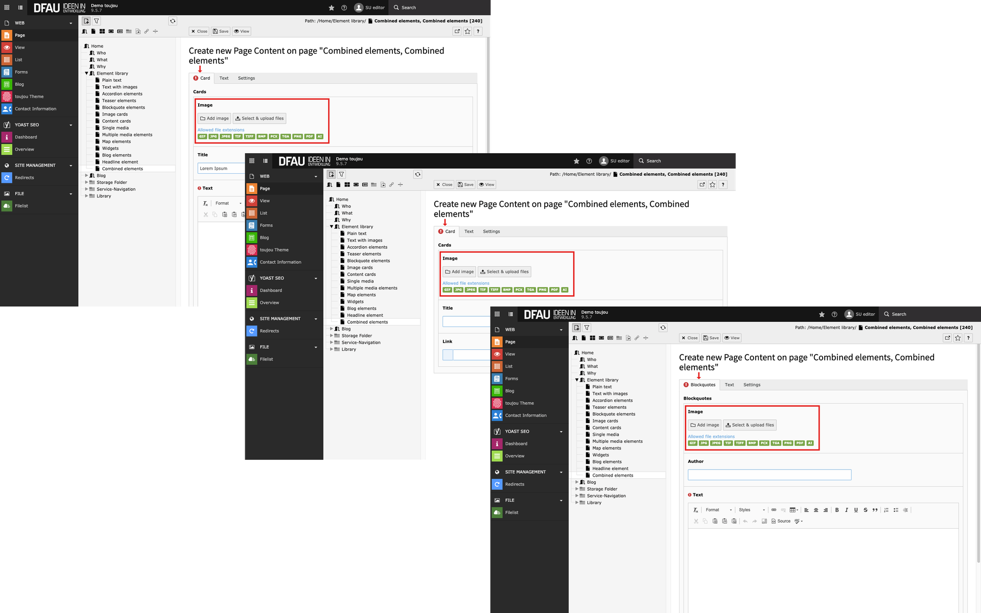 - The combined elements for content cards, image cards, and blockquotes offer the possibility of uploading images.