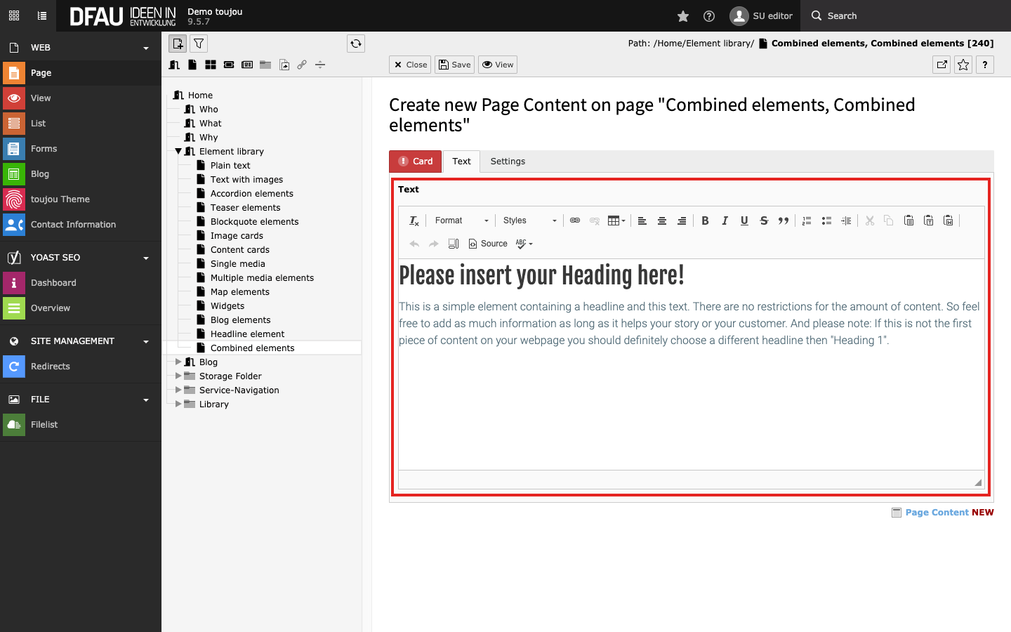 - Click the + Content button to create any combined element.