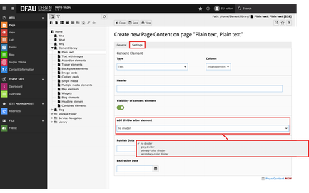 - Within any element, click the Settings tab. In the add divider after element section choose between grey divider, primary-color divider, or secondary-color divider from the drop-down menu.
