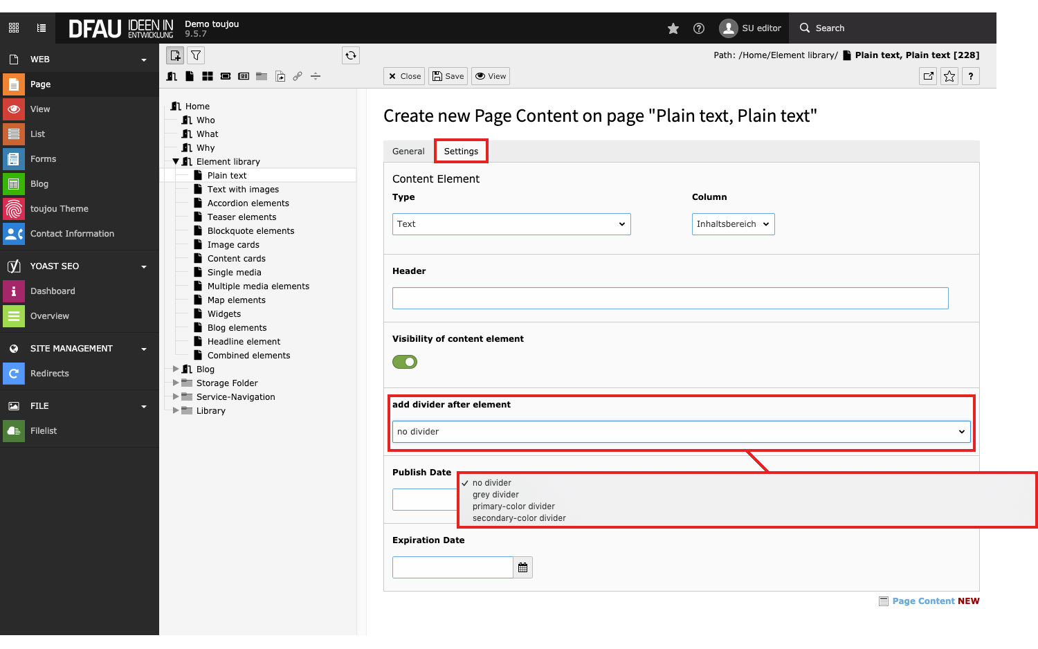 To visually structure the content elements in the frontend, you have the option of creating dividing lines. However, the insertion of the divider is not done as an independent content element, but can be activated by you within almost all toujou elements.