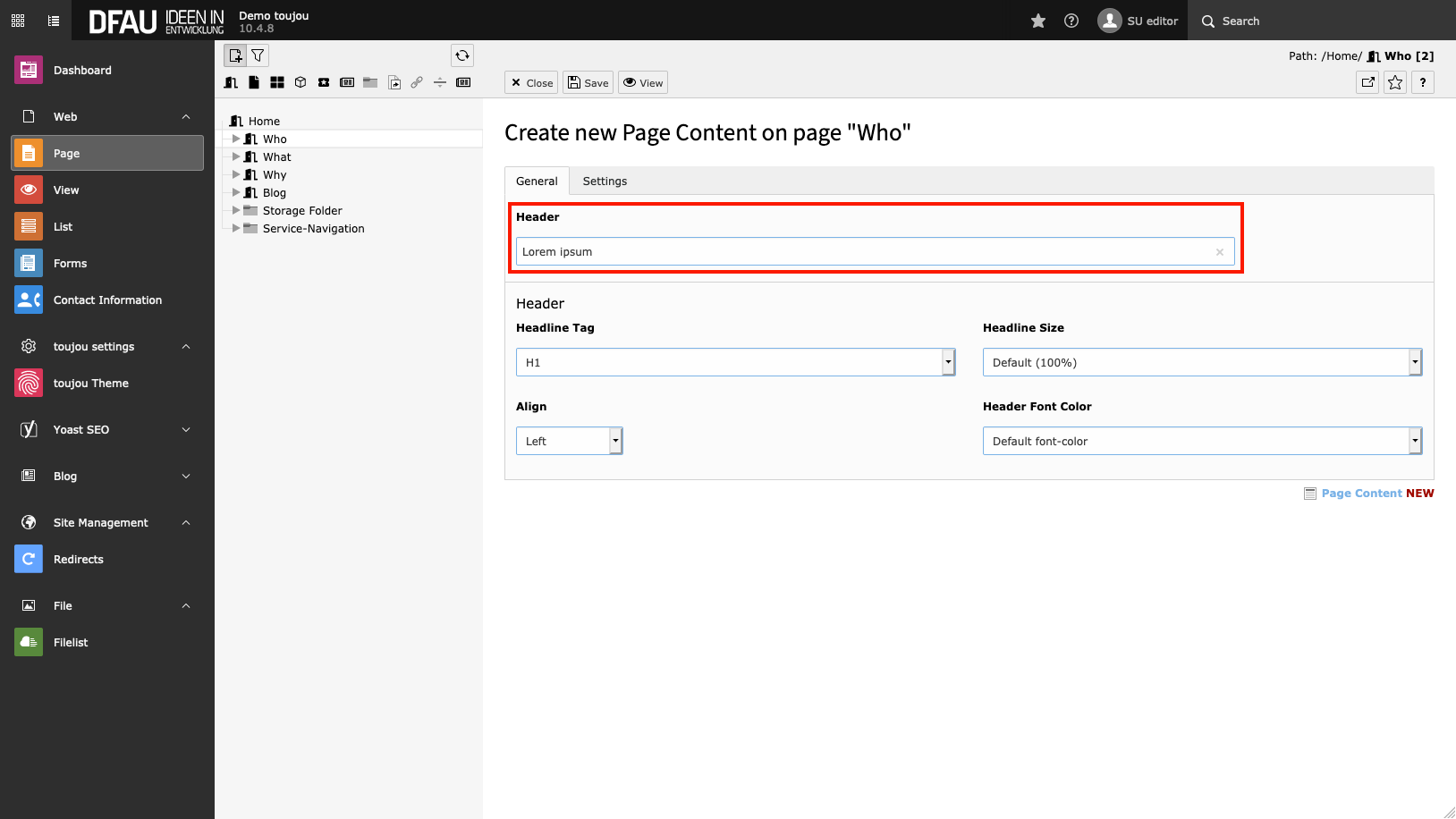 - Click on the + Content button to create a headline element.