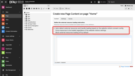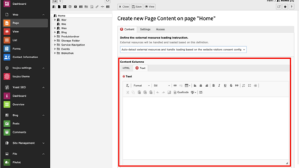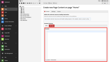 - In the Content editor, write HTML directly or insert an external code.