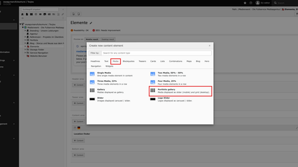 The Portfolio Gallery combines slider and gallery in an element. On desktop devices, the element is displayed as a grid element with a maximum of five images. On mobile, the media content is presented as a slider.