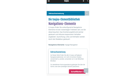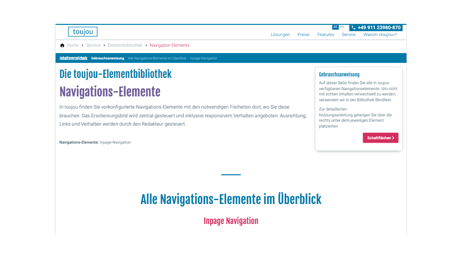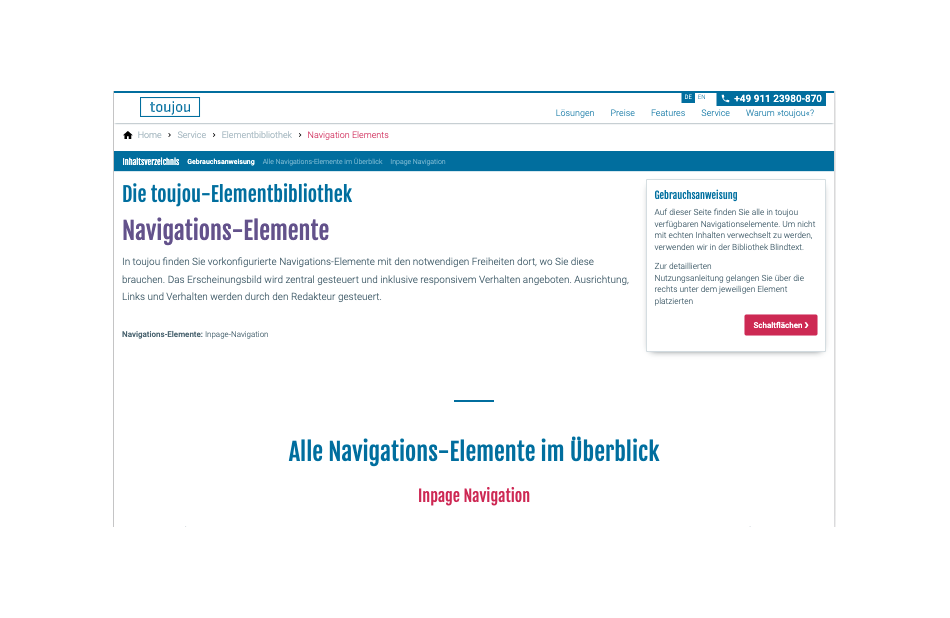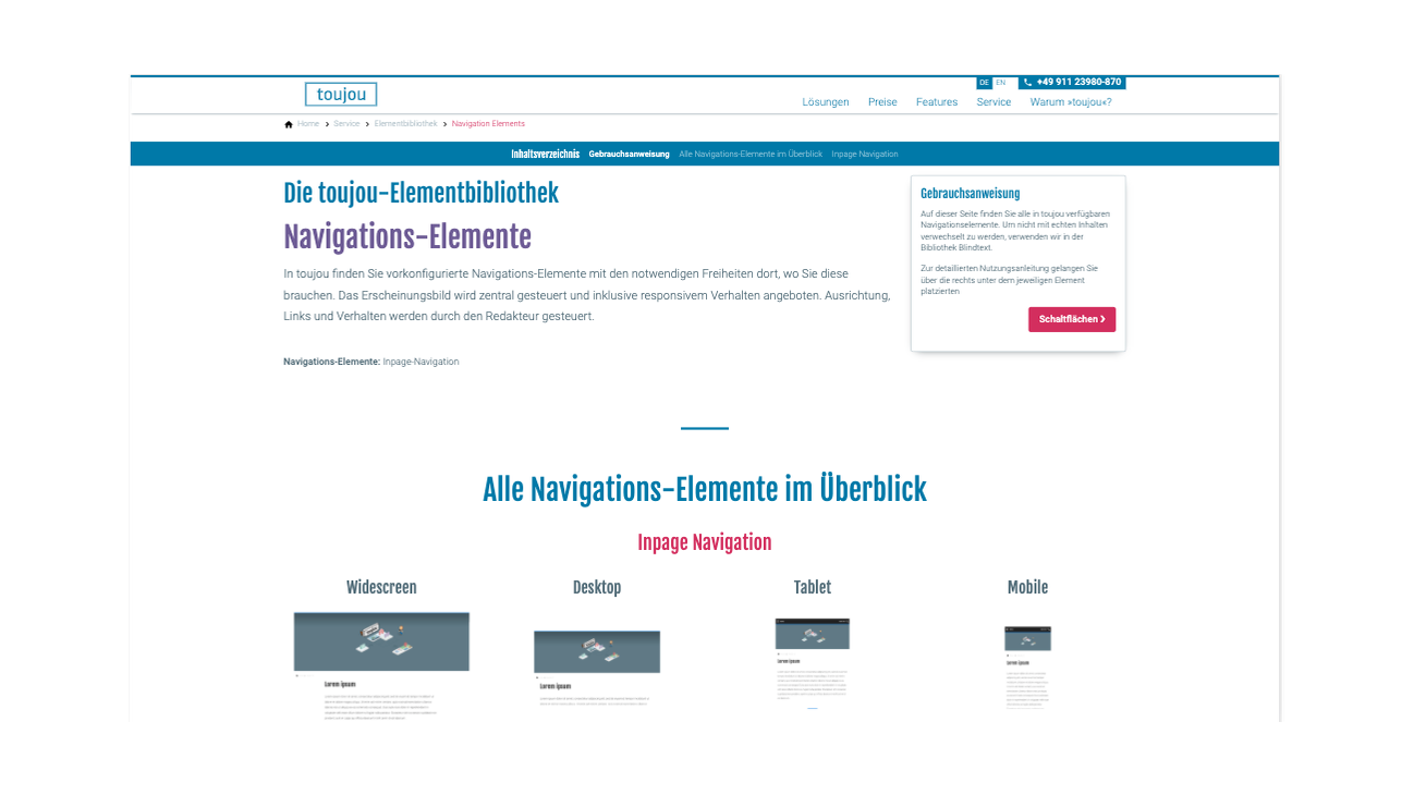 With toujou you will find preconfigured elements that give you the freedom to illustrate content according to your needs. The appearance is controlled centrally and offers responsive behaviour. Buttons, links, alignment, and text styles are all controlled by the editor. The Auto Inpage Navigation references to all chapters, whereas the Inpage Navigation offers individual manual selection.