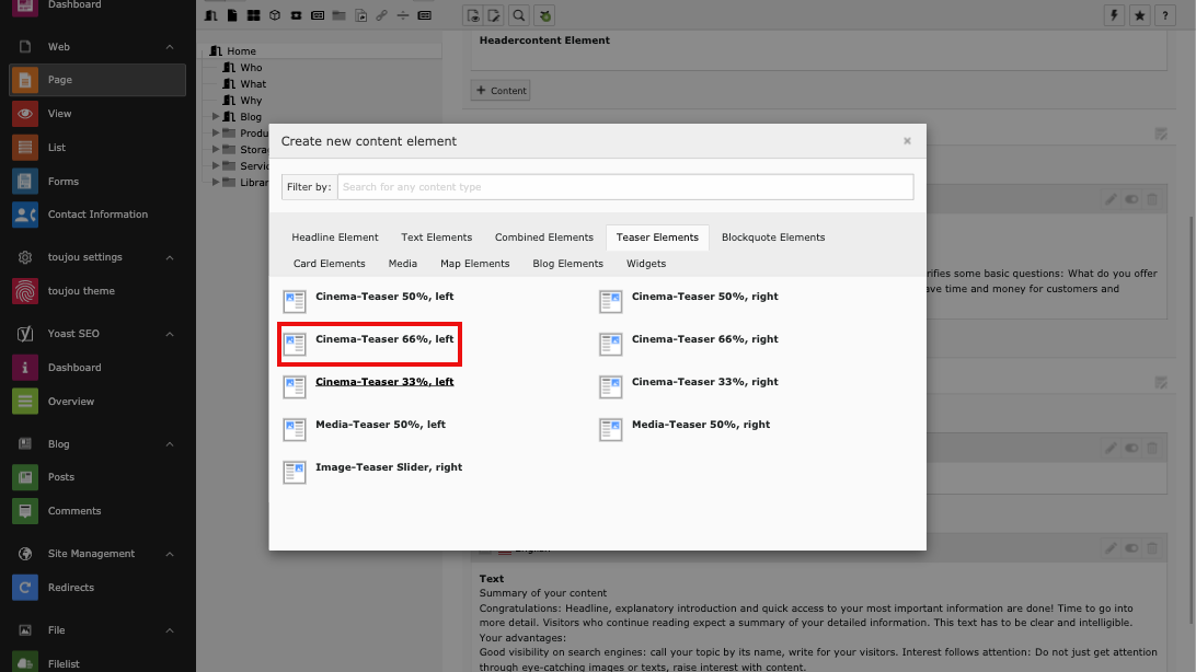 - In the Teaser Elements tab, select the Cinema Teaser 66%, left.
