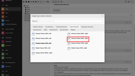 - Click on the + Content button to create any of the teaser elements.