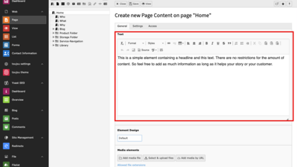 - The text can be formatted directly in the text field (called Rich Text Editor), using the menu above the text field.