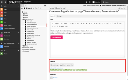 - Select an image file from your file list or upload a file to the appropriate folder (Select & upload files).