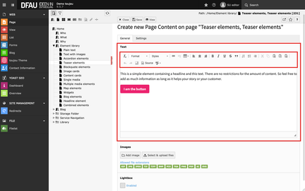 - The text can be formatted directly within the rich text editor, with the help of the menu above the editor.