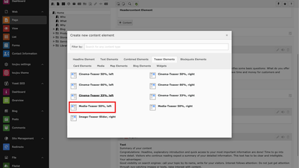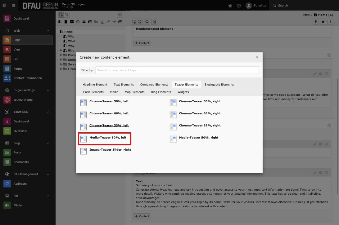 - In the Teaser Elements tab, select the Media-Teaser 50%, left.