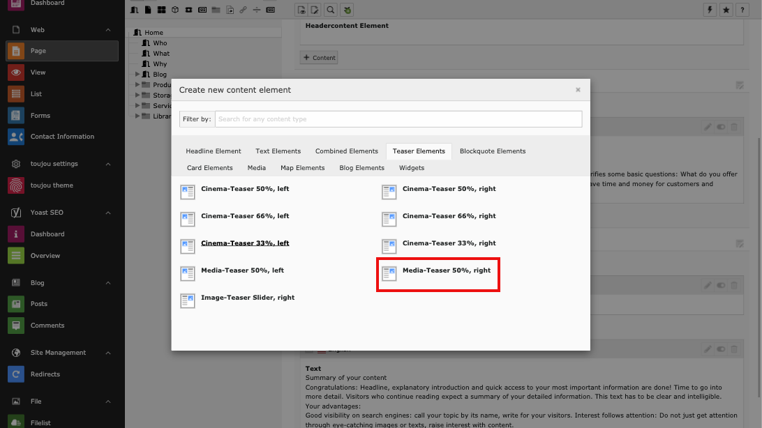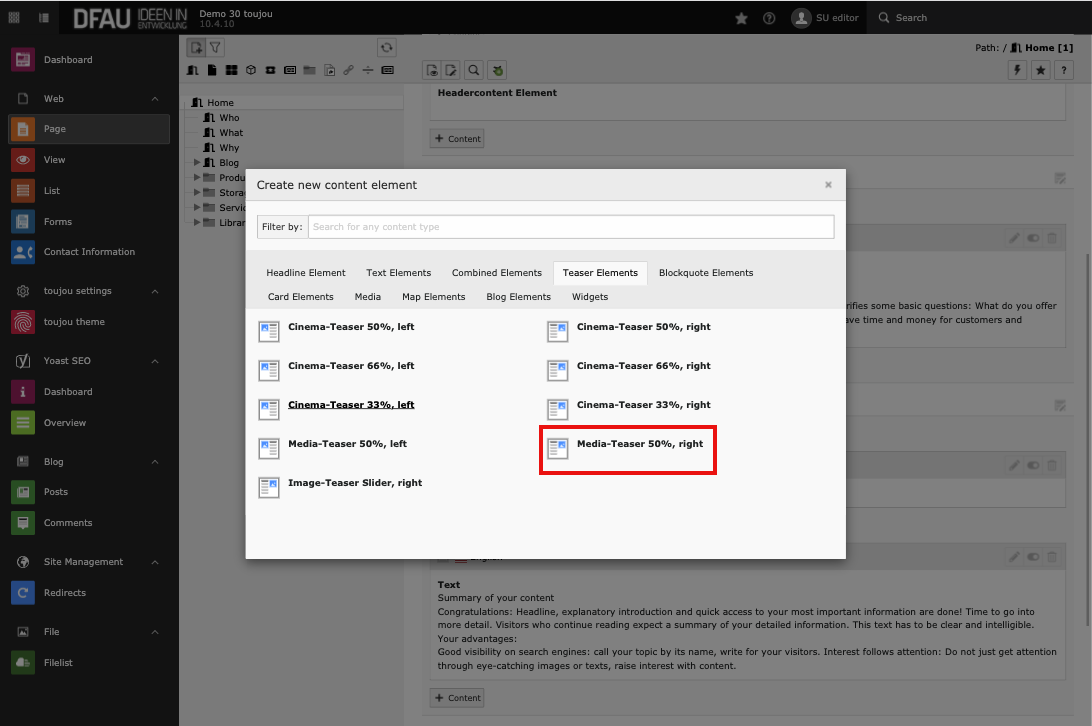 - In the Teaser Elements tab, select the Media-Teaser 50%, right.