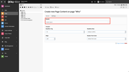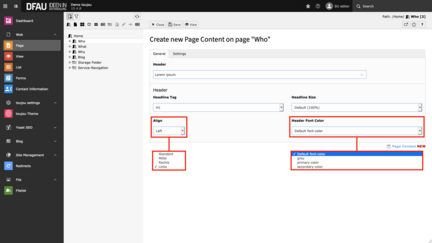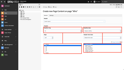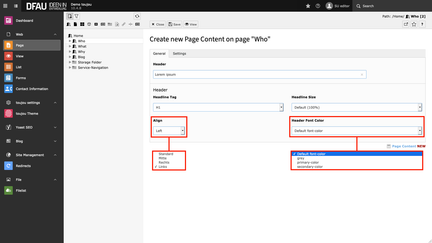 By default, H1, H4, and H5 headers use the font color (Default font-color), H2 the primary-color, and H3 the secondary-color. In the settings tab, you have the possibility to vary the assigned default colors and sizes to your taste and/or needs.