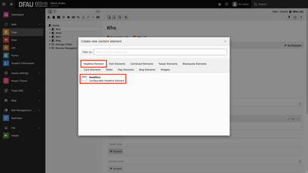 - Click on the + Content button to create a headline element.