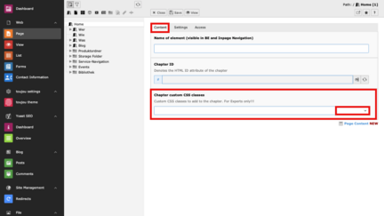 The chapter element can be described as a chapter of a book, where CSS classes can be stored. These customizations are then only valid for the corresponding area and allow for detailed individualization on a page. A chapter ends automatically with the start of a new chapter.