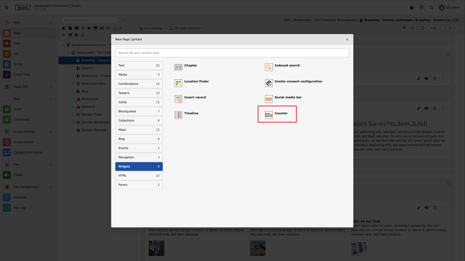 - After clicking on + New Content in the content area of your page, the window for selecting the element will open. Select the Widgets tab and then Counter.