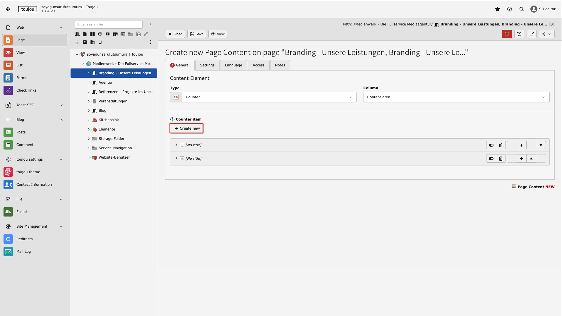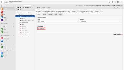 - Click on + Create new in the General tab to create additional counters in the element. Depending on the device, these will be displayed next to or below each other.