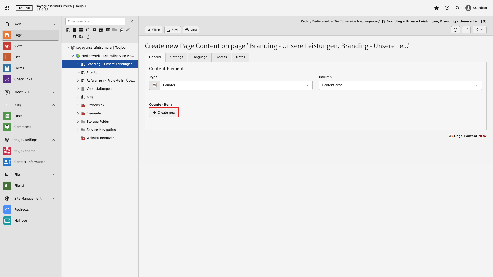 - Click on + Create new in the General tab to create a new counter.