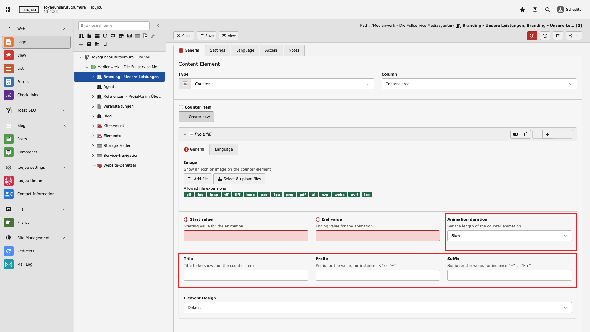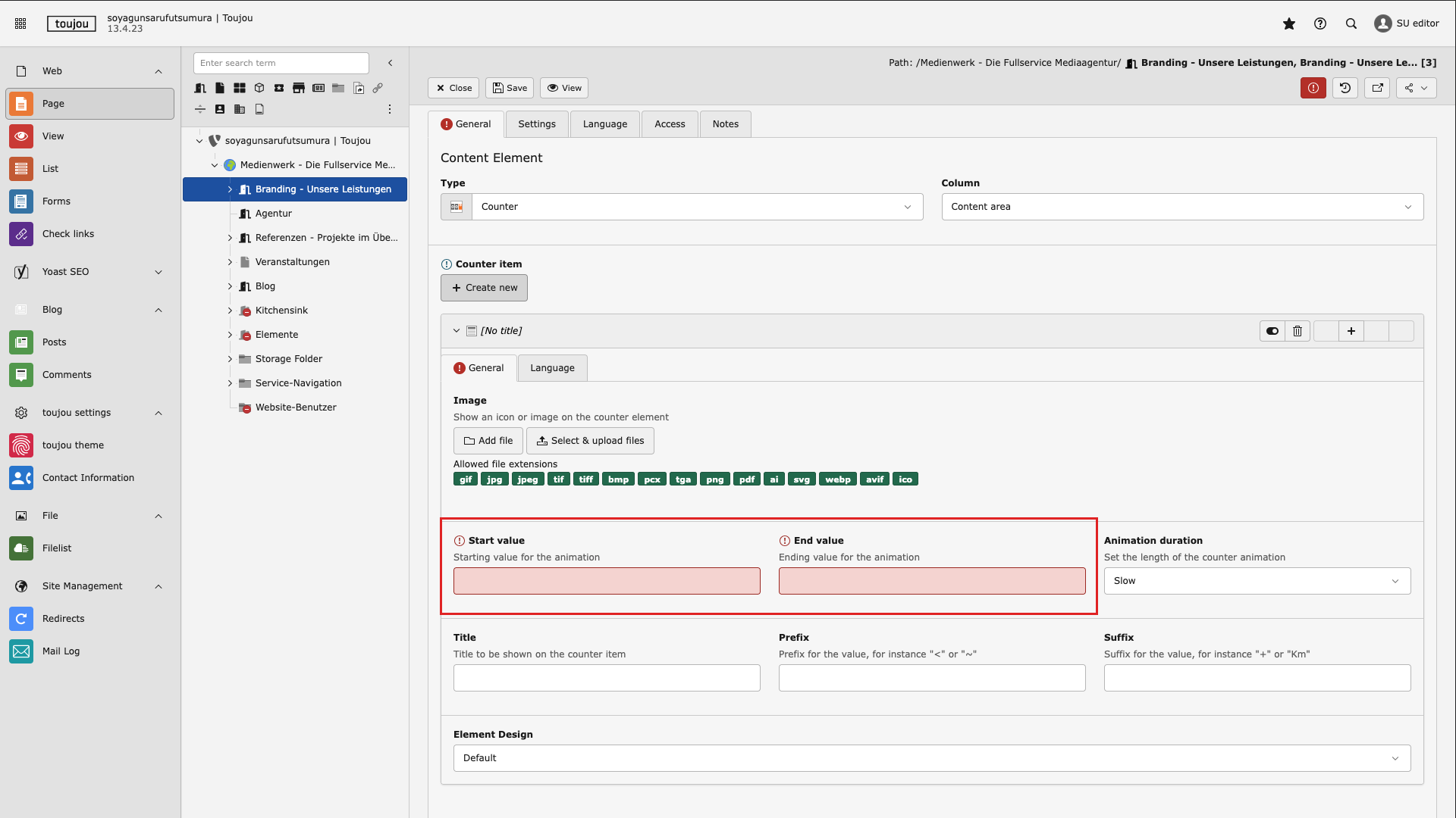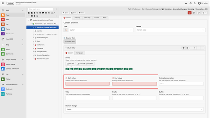 Special features: For the counter element to function, a start and end value must be entered. These two fields must be filled in with numbers. Other fields are optional. At least one counter must always be created. Additional counters can be added to the element at any time.