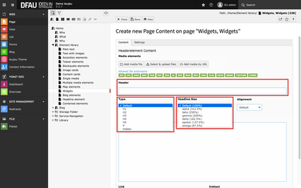 - In the Content tab, an H2 tag is assigned by default. If necessary, change this setting via Type and Headline Size (more about Headlines ❯).