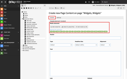 - Click on the + Content button and select the Header-Media Element (3:1-ratio) element under the Widgets tab.