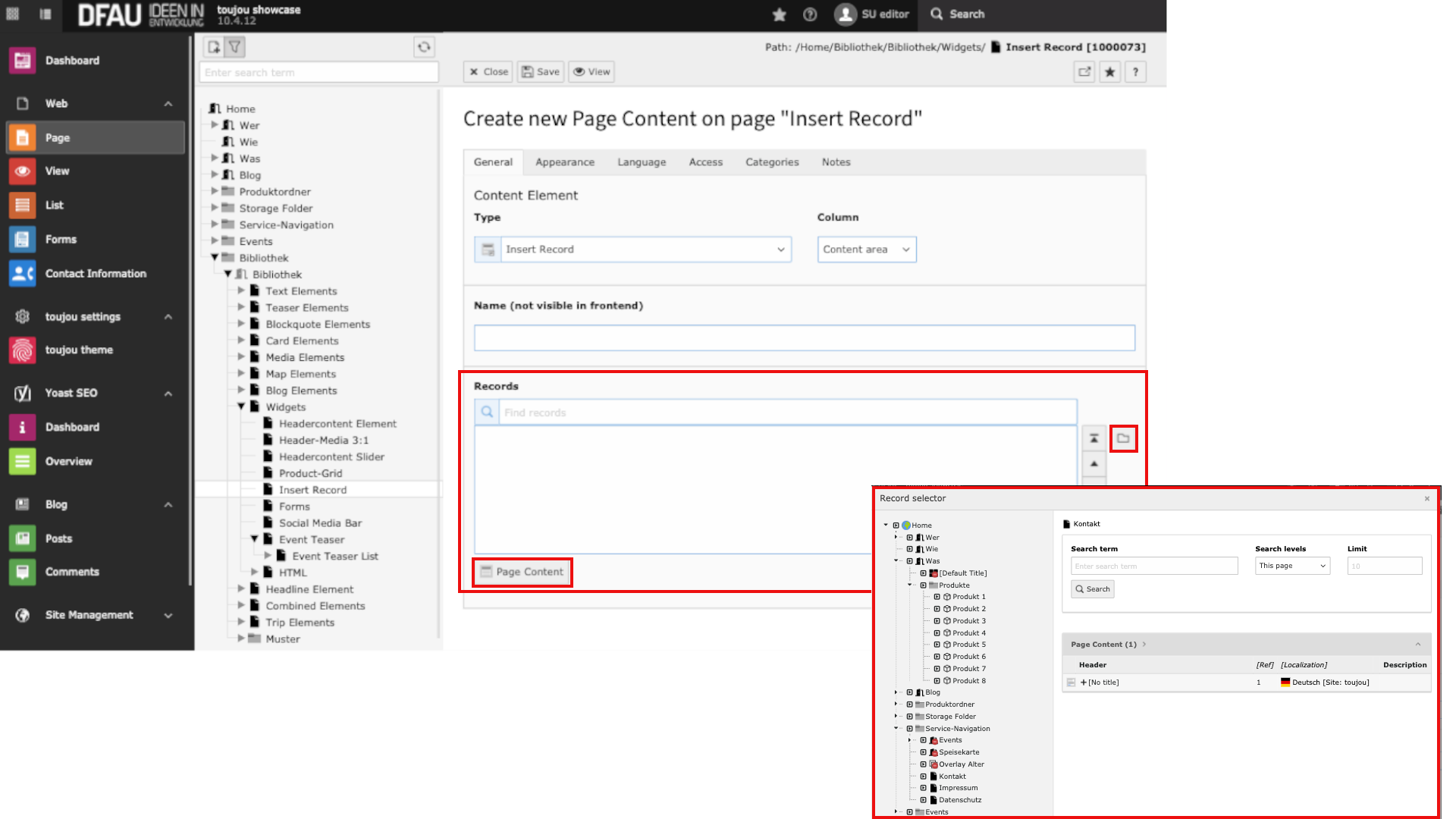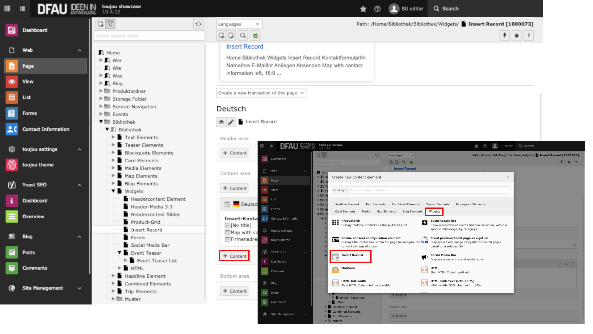 - Click the +Content button and select the Insert Record element under the Widgets tab.