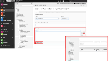 - In the records section, after clicking on either the page Content or the folder button, the record selection window will open.
