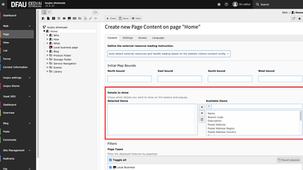 - To define a map section that will be displayed when the page is loaded for the first time you have to enter the coordinates in the Initial Map Bounds area within the Content tab.