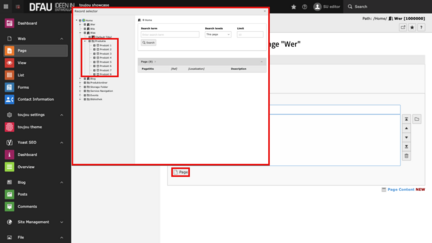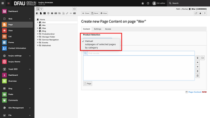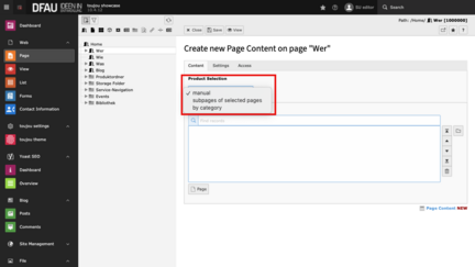 - Subpages of selected pages: Select this option if you want to place your products below a landing page or e.g. a folder (see screenshot: Product Overview folder). Click on this parent page only and the product pages below will automatically be displayed.