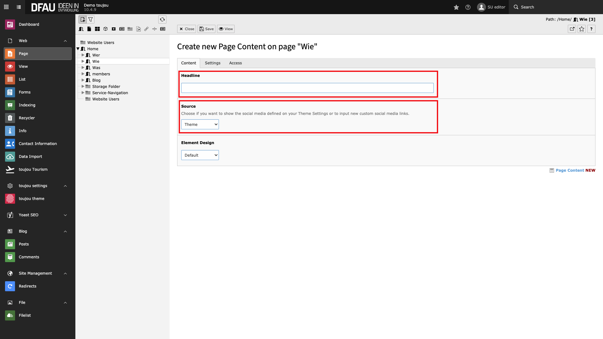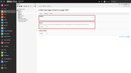 To get a frame around this element, you have to put a headline in the corresponding field. With toujou, the social media bar links your respective profiles to the links set in the toujou setup automatically. If you would like different links to social media, i.e. for a campaign page, you can modify the desired links in the »source« field with the »custom« option.