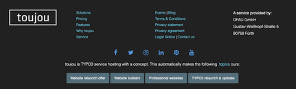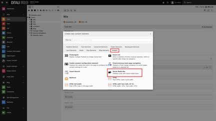 Whether you want to place the social media bar in the content area of a page or in the footer; you’ll have to create a new content element. The links to your corresponding profiles should be accessible prior to the creation of the social media bar. The links can be set in the module bar under »toujou Theme« in the »Social Media« tab.