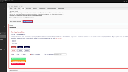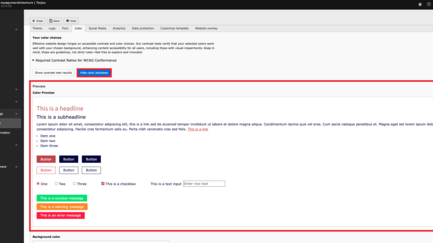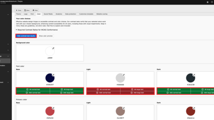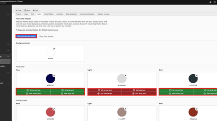 - With regard to accessibility / WCAG you can test your set colors for sufficient contrast. You can also get sample views for various use cases of the font, primary, and secondary colors.