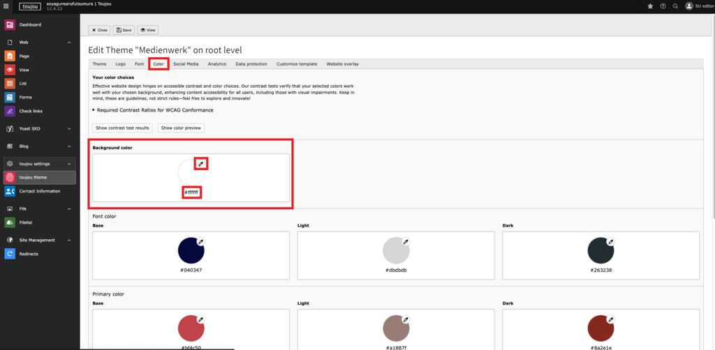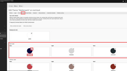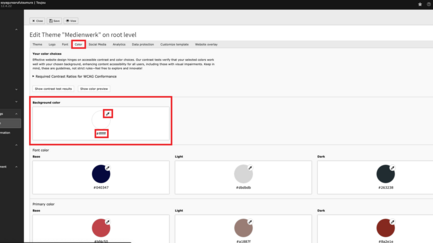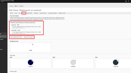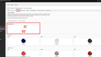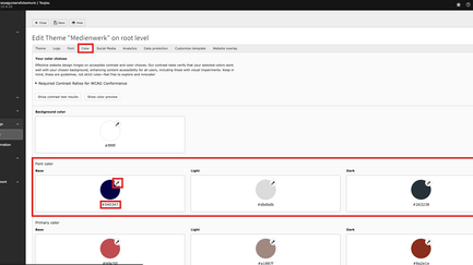- You can also set the font color of your website. Therefore you can define a base value as well as a light and a dark variant in the respective font color area.