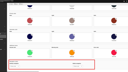 - Here you determine which of the color sets is used for navigation on the desktop as well as on mobile devices. For Desktop Navigation the values Primary Colors, Secondary Colors and Font Colors are offered, for Mobile Navigation only Primary Colors and Secondary Colors.