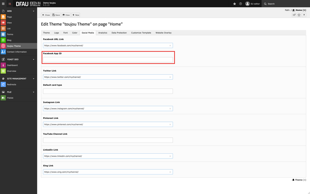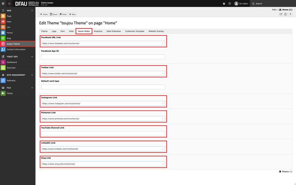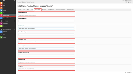 - To display social media icons (e.g. in the footer), the URLs for the channels you offer must be created in one place.