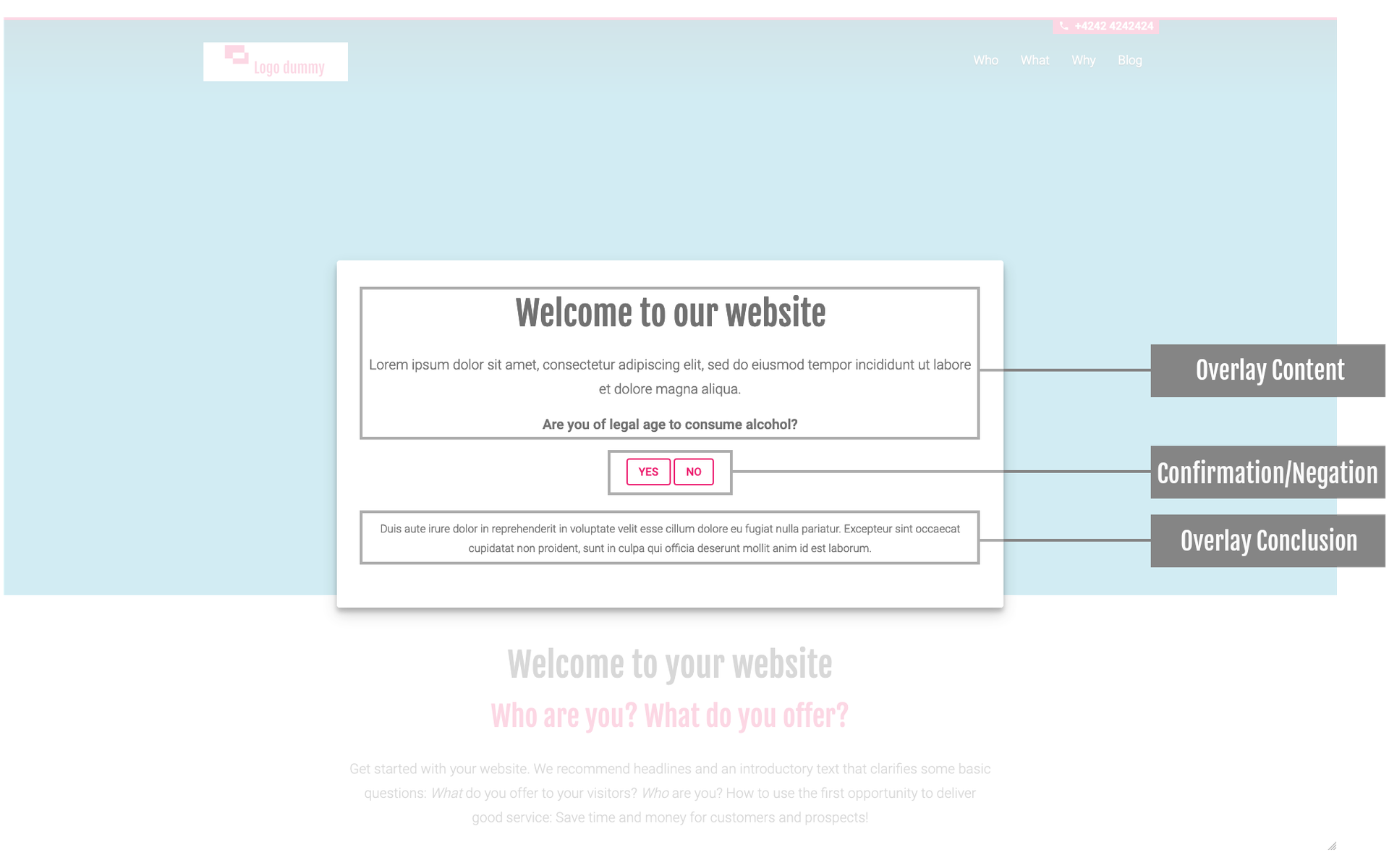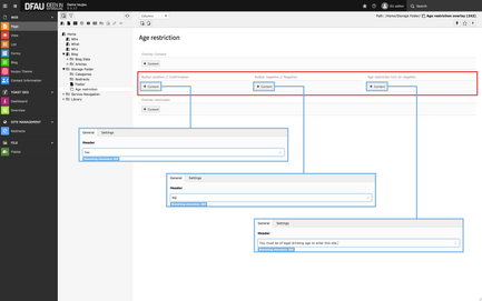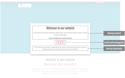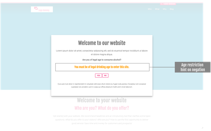 - The screenshot shows sample content in case you need to display an age restriction for your website offer. A prerequisite for the displayed content is a question about the age of your visitors, which you must include in the overlay content (see front end view).