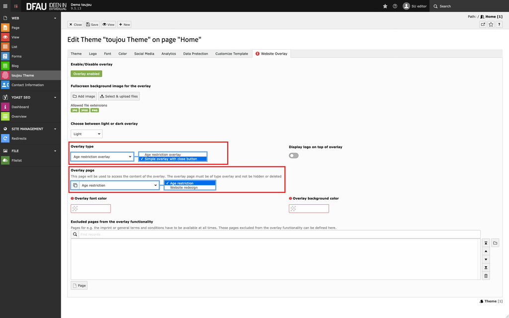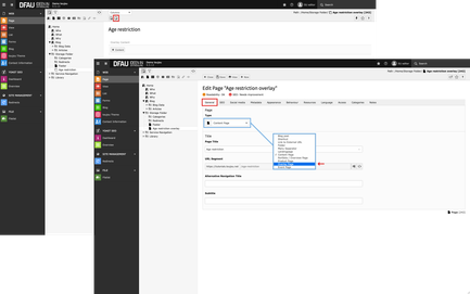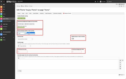- Overlay type: Here you define whether you (must) place an age restriction page or whether it is a »simple« page overlay.
