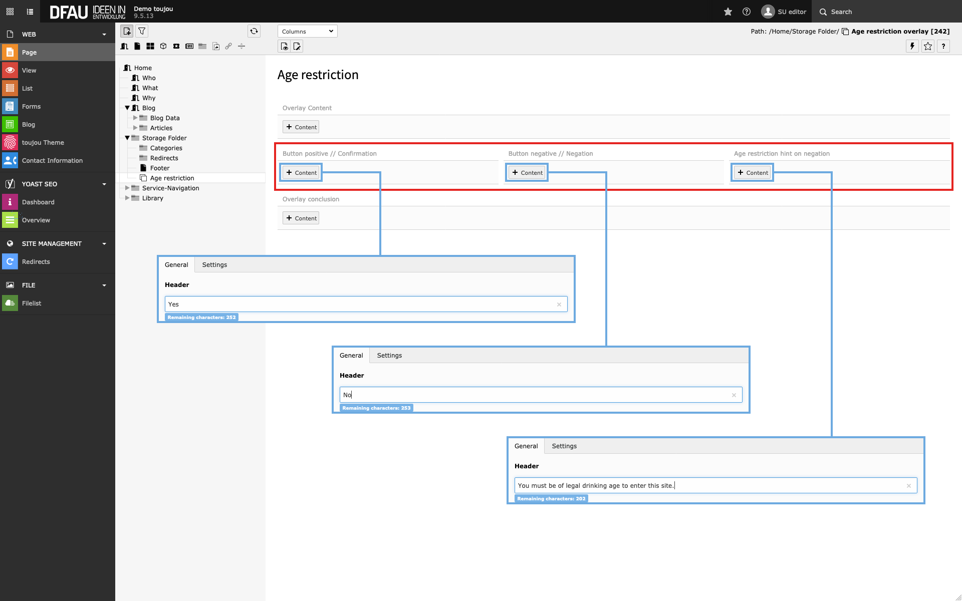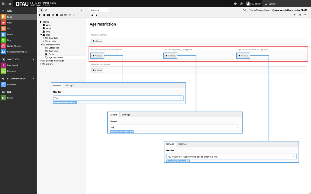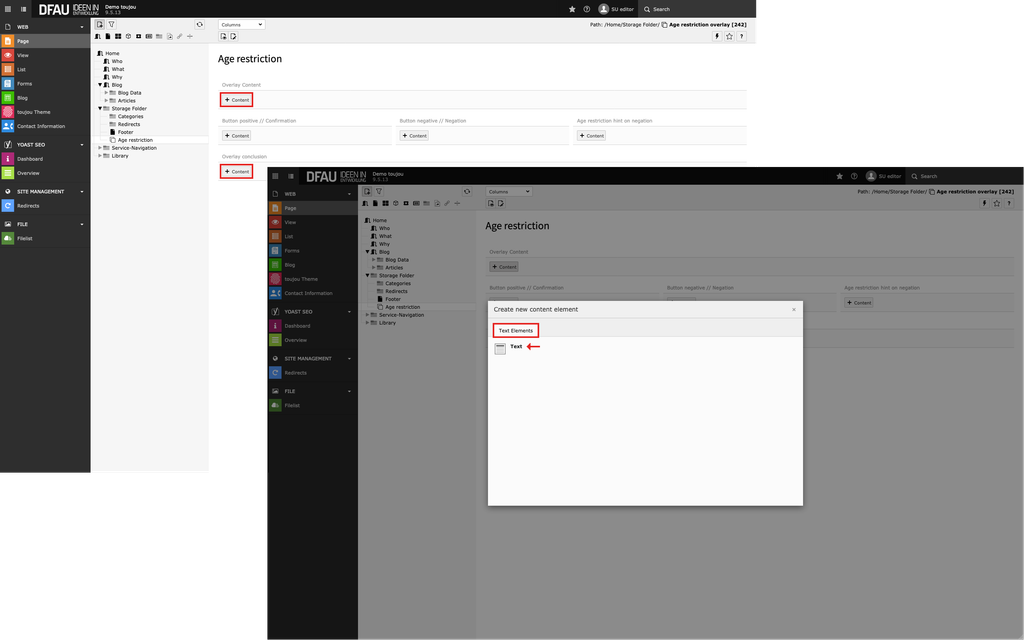 - Give the content page a new title; in our example, we will first create an age-restriction overlay page and name it »Age restriction«.