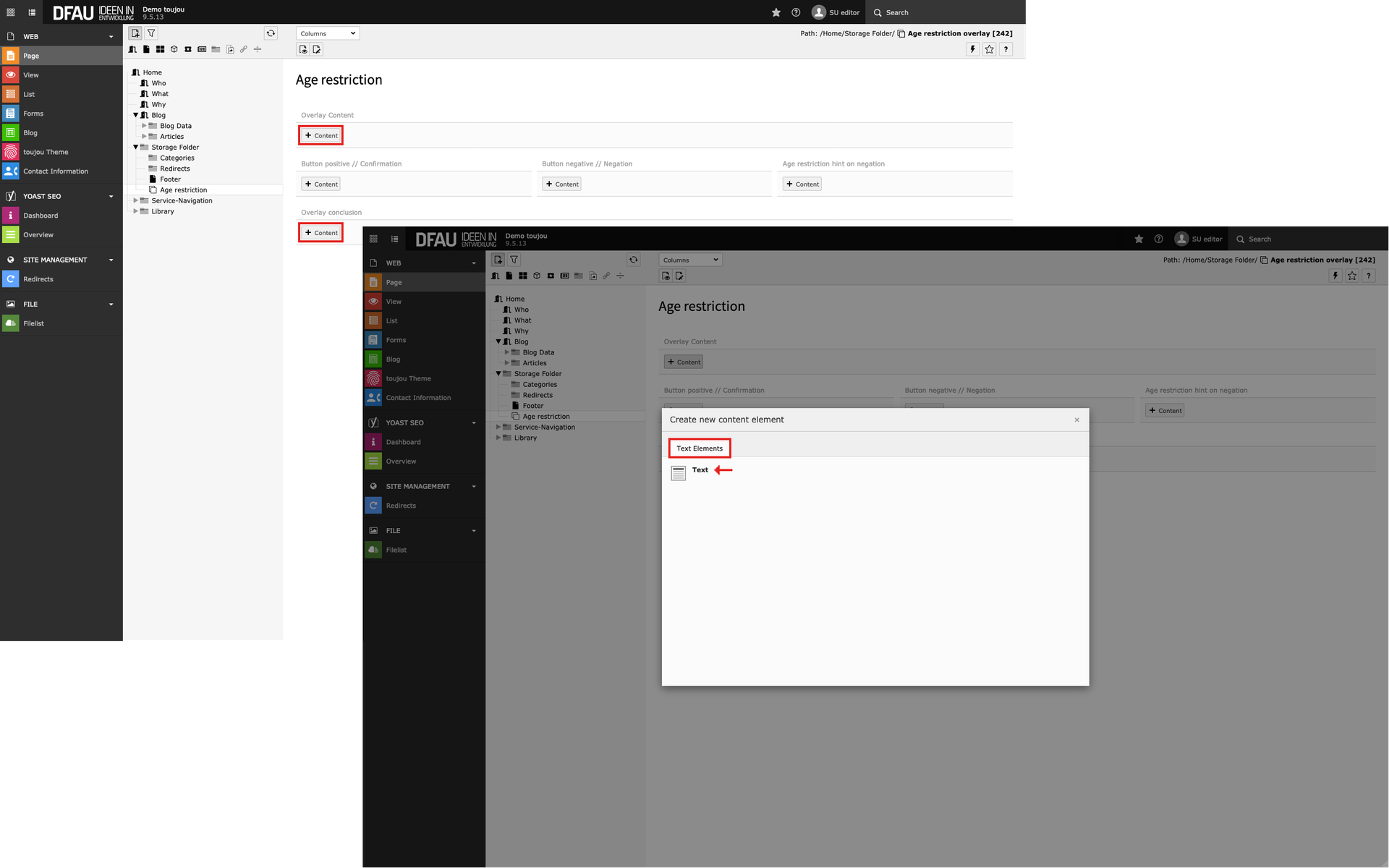To use toujou’s overlay pages, the page type must first be filled with content. The following tutorial will help you to set up one or more overlay pages manually.