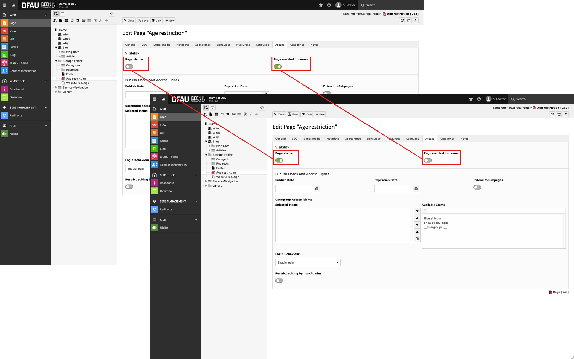 - By default, pages under construction will be hidden. Activate the switch in the Page visible area to make the page visible in the front end to ensure the overlay is functioning.