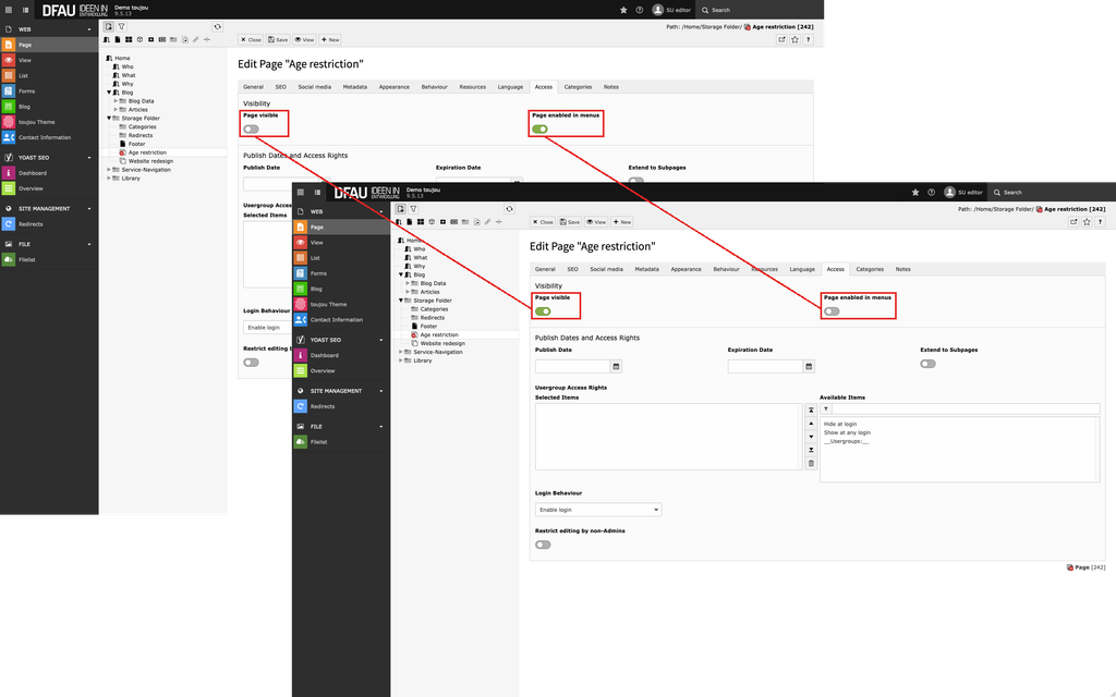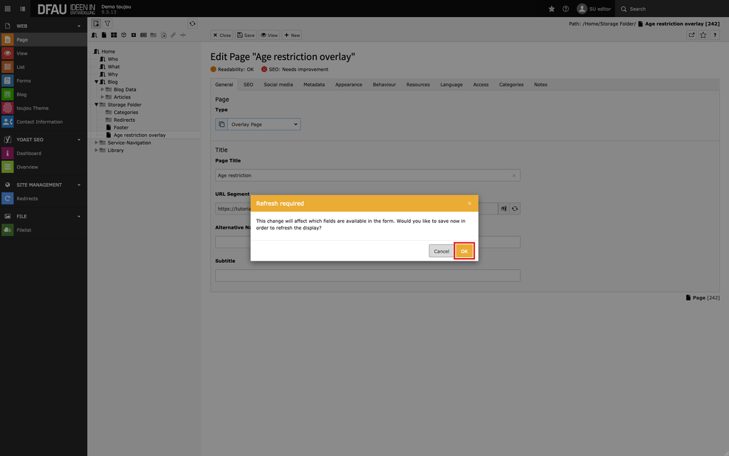 - Since the change of the page type described above has consequences for the functionality and content of existing pages, you must confirm this change separately.